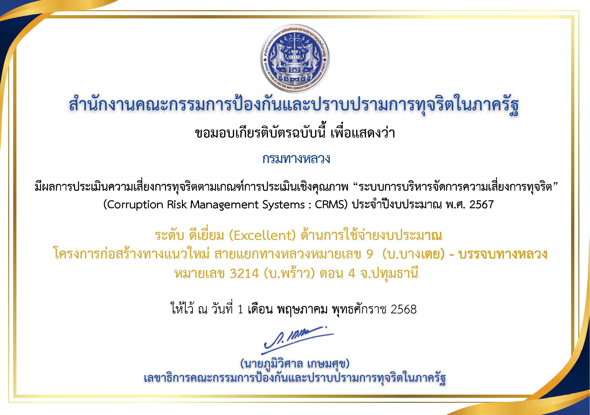 กรมทางหลวงมีผลคะแนนการประเมินความเสี่ยงการทุจริตตามเกณฑ์การประเมินเชิงคุณภาพฯ ประจำปีงบประมาณ พ.ศ. ๒๕๖๗ ในระดับ Excellent : E (ดีเยี่ยม)