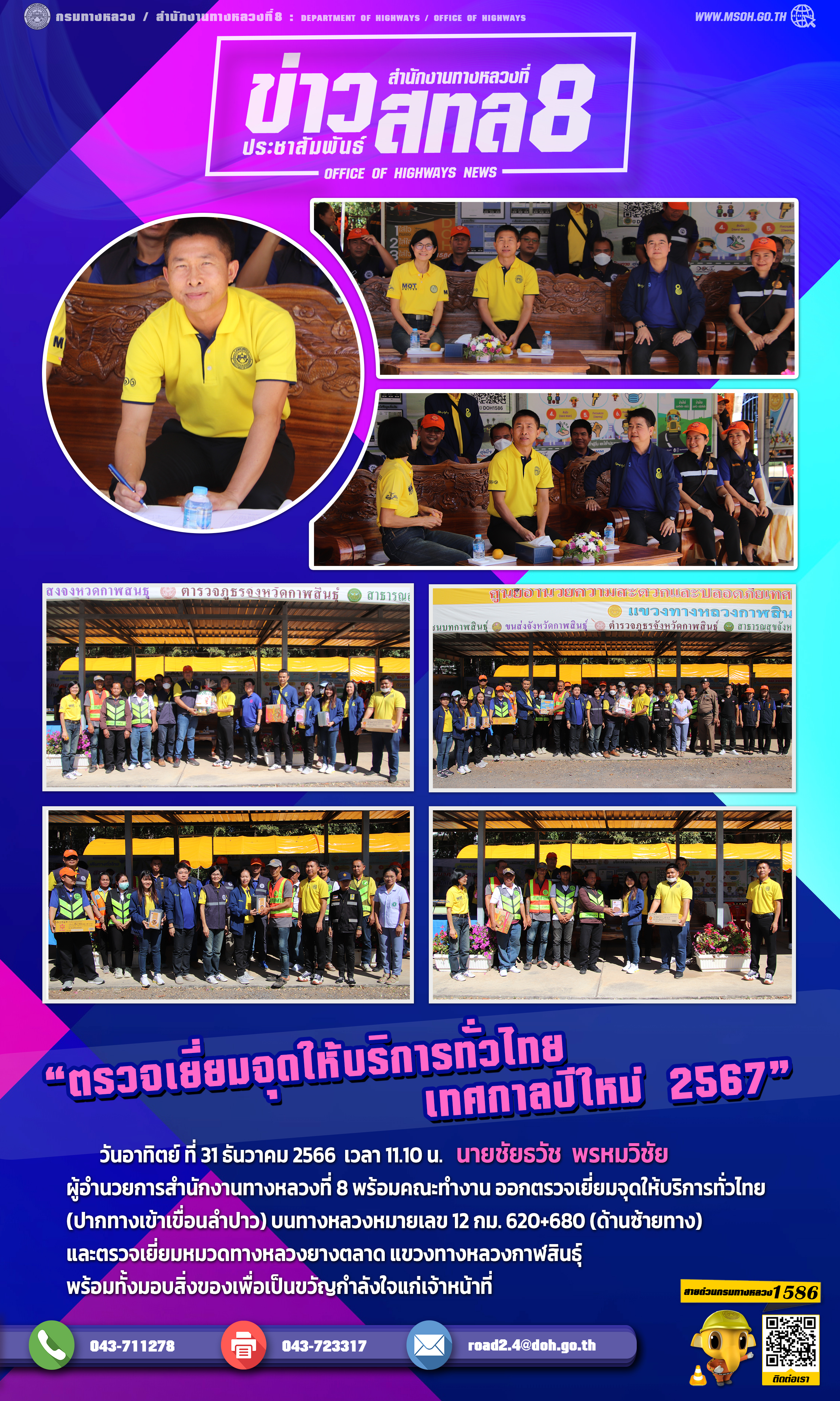 วันอาทิตย์ ที่ 31 ธันวาคม 2566 เวลา 11.10 น. นายชัยธวัช พรหมวิชัย ผู้อำนวยการสำนักงานทางหลวงที่ 8 พร้อมคณะทำงาน ออกตรวจเยี่ยมจุดให้บริการทั่วไทย (ปากทางเข้าเขื่อนลำปาว) บนทางหลวงหมายเลข 12 กม. 620+680 (ด้านซ้ายทาง) และตรวจเยี่ยมหมวดทางหลวงยางตลาด แขวงทางหลวงกาฬสินธุ์ พร้อมทั้งมอบสิ่งของเพื่อเป็นขวัญกำลังใจแก่เจ้าหน้าที่
