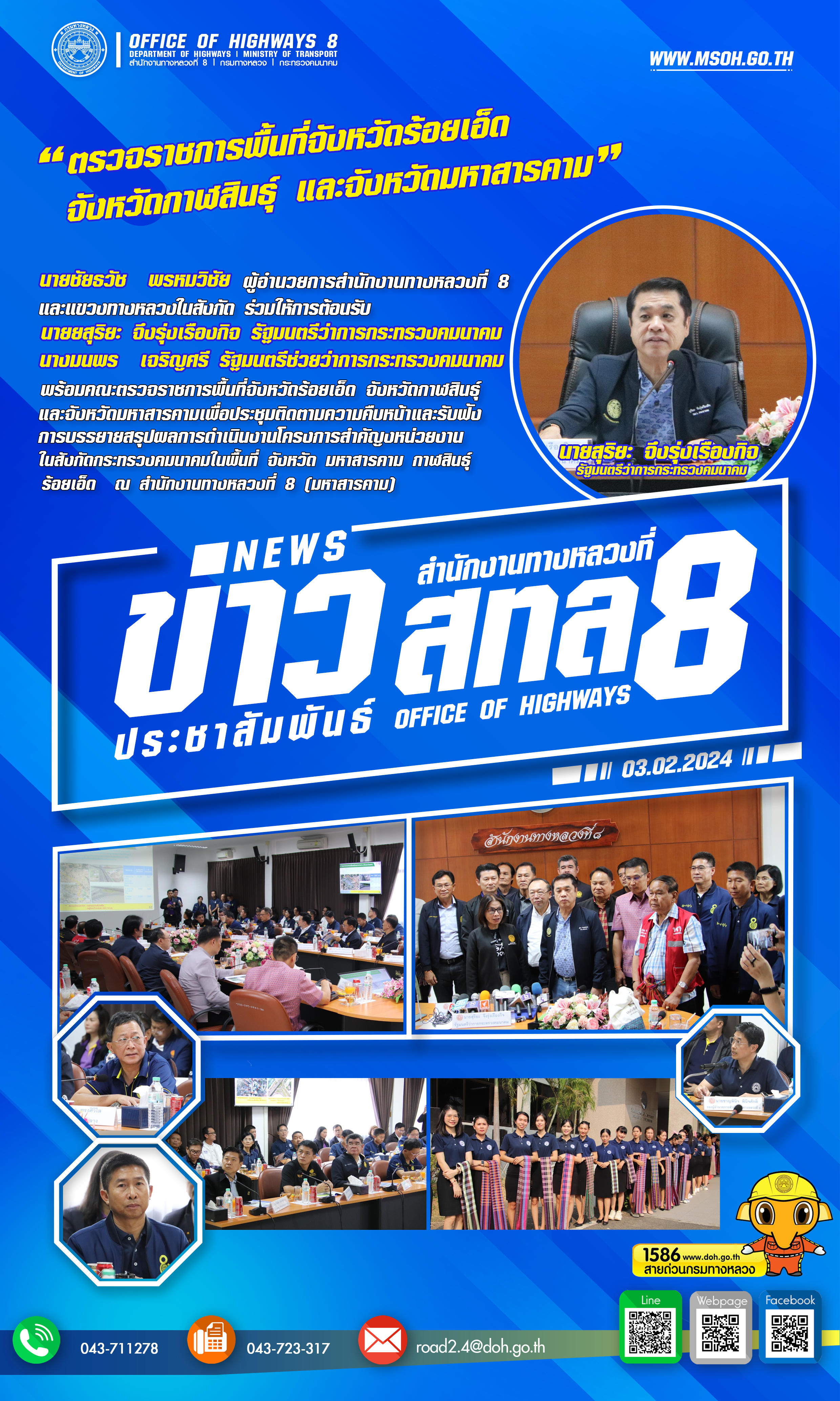 วันเสาร์ ที่ 3 กุมภาพันธ์ 2567 เวลา 09.30 น. นายชัยธวัช พรหมวิชัย ผู้อำนวยการสำนักงานทางหลวงที่ 8 และแขวงทางหลวงในสังกัด ร่วมให้การต้อนรับ นายสุริยะ จึงรุ่งเรืองกิจ รัฐมนตรีว่าการกระทรวงคมนาคม นางมนพร เจริญศรี รัฐมนตรีช่วยว่าการกระทรวงคมนาคม พร้อมคณะตรวจราชการพื้นที่จังหวัดร้อยเอ็ด จังหวัดกาฬสินธุ์ และจังหวัดมหาสารคาม เพื่อประชุมติดตามความคืบหน้าและรับฟังการบรรยายสรุปผลการดำเนินงานโครงการสำคัญของหน่วยงานในสังกัดกระทรวงคมนาคมในพื้นที่ จังหวัด มหาสารคาม กาฬสินธุ์ ร้อยเอ็ด ณ ห้องประชุมพระธาตุนาดูน สำนักงานหลวงที่ 8 (มหาสารคาม)