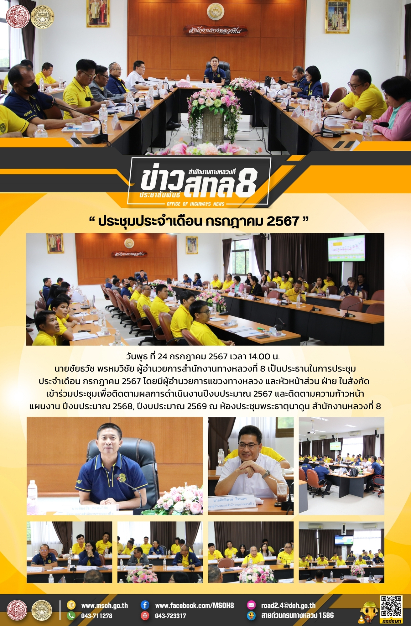 วันพุธ ที่ 24 กรกฎาคม 2567 เวลา 14.00 น. นายชัยธวัช พรหมวิชัย ผู้อำนวยการสำนักงานทางหลวงที่ 8 เป็นประธานในการประชุมประจำเดือน กรกฎาคม 2567 โดยมีผู้อำนวยการแขวงทางหลวง และหัวหน้าส่วน ฝ่าย ในสังกัด เข้าร่วมประชุมเพื่อติดตามผลการดำเนินงานปีงบประมาณ 2567 และติดตามความก้าวหน้าแผนงาน ปีงบประมาณ 2568, ปีงบประมาณ 2569 ณ ห้องประชุมพระธาตุนาดูน สำนักงานหลวงที่ 8