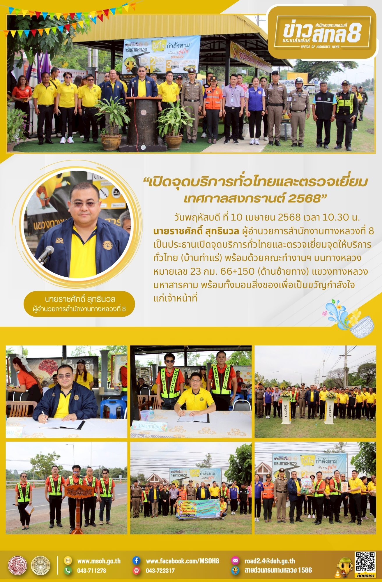 วันพฤหัสบดี ที่ 10 เมษายน 2568 เวลา 10.30 น. นายราชศักดิ์ สุทธินวล ผู้อำนวยการสำนักงานทางหลวงที่ 8 เป็นประธานเปิดจุดบริการทั่วไทยและตรวจเยี่ยมจุดให้บริการทั่วไทย (บ้านท่าแร่) พร้อมด้วยคณะทำงานฯ บนทางหลวงหมายเลข 23 กม. 66+150 (ด้านซ้ายทาง) แขวงทางหลวงมหาสารคาม พร้อมทั้งมอบสิ่งของเพื่อเป็นขวัญกำลังใจแก่เจ้าหน้าที่