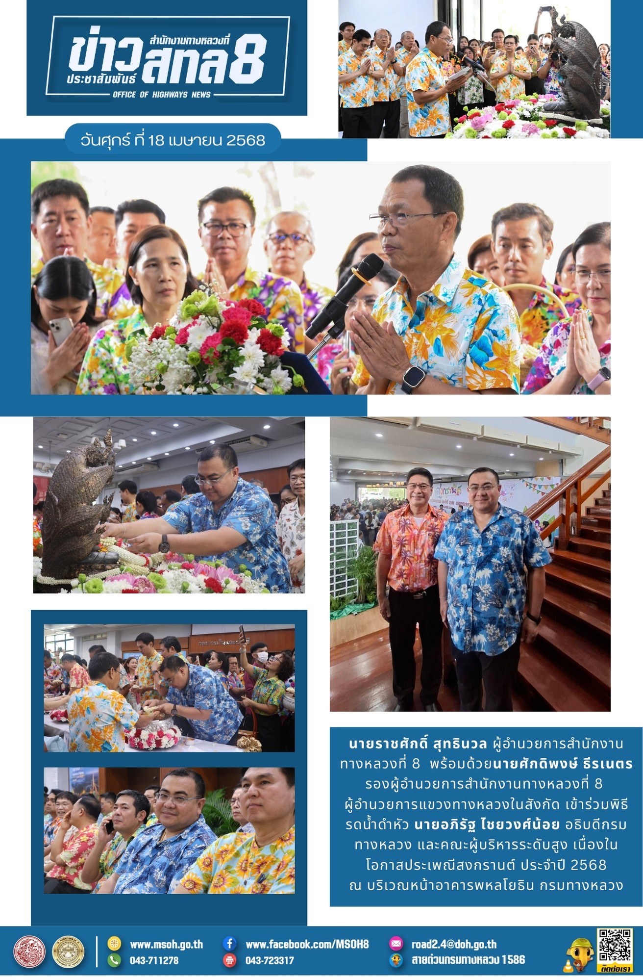 วันศุกร์ ที่ 18 เมษายน 2568 นายราชศักดิ์ สุทธินวล ผู้อำนวยการสำนักงานทางหลวงที่ 8 พร้อมด้วยนายศักดิพงษ์ ธีรเนตร รองผู้อำนวยการสำนักงานทางหลวงที่ 8 ผู้อำนวยการแขวงทางหลวงในสังกัด เข้าร่วมพิธีรดน้ำดำหัว นายอภิรัฐ ไชยวงศ์น้อย อธิบดีกรมทางหลวง และคณะผู้บริหารระดับสูง เนื่องในโอกาสประเพณีสงกรานต์ ประจำปี 2568 ณ บริเวณหน้าอาคารพหลโยธิน กรมทางหลวง