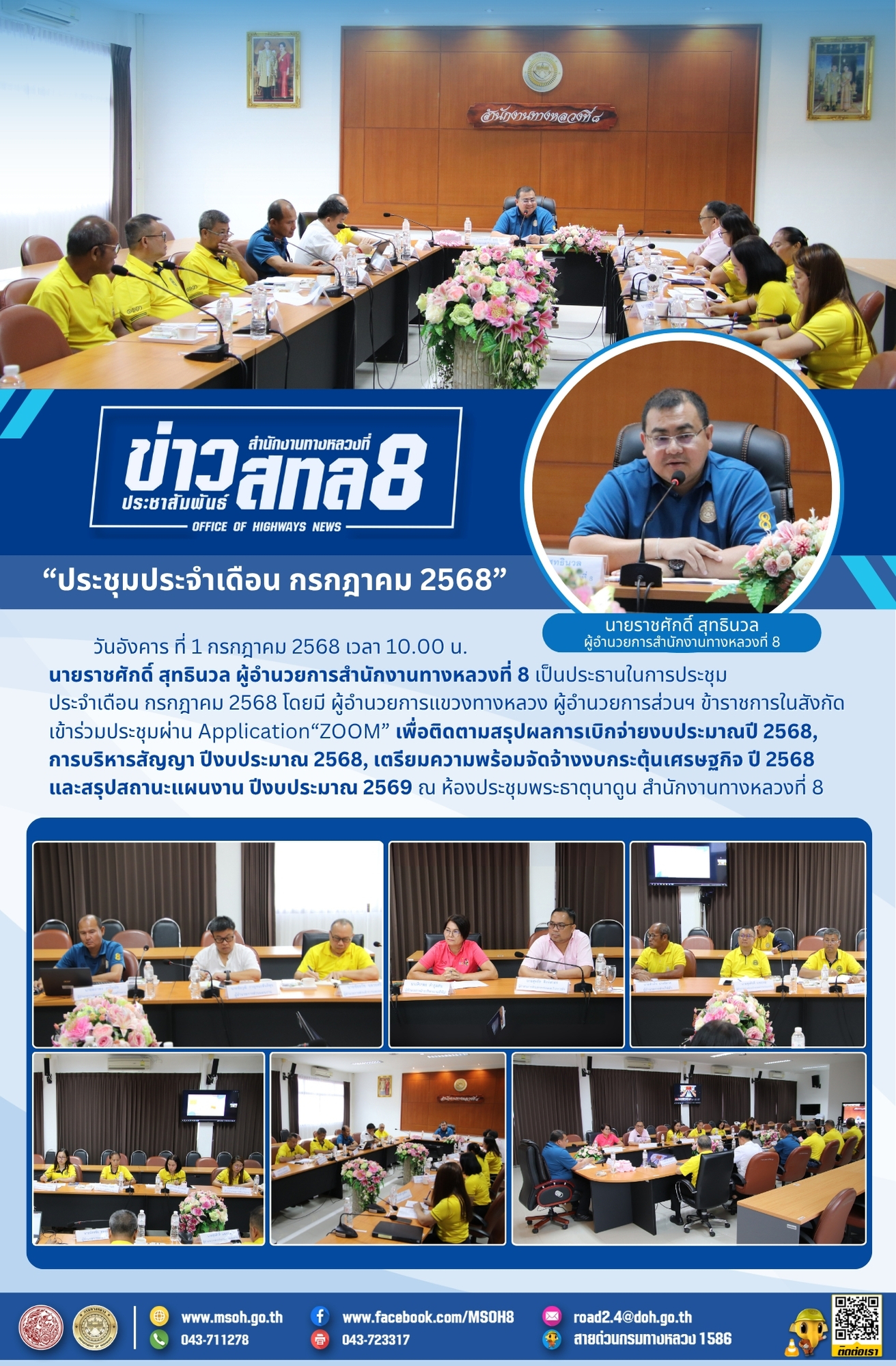 วันอังคาร ที่ 1 กรกฎาคม 2568 เวลา 10.00 น.นายราชศักดิ์ สุทธินวล ผู้อำนวยการสำนักงานทางหลวงที่ 8 เป็นประธานในการประชุมประจำเดือน กรกฎาคม 2568 โดยมี ผู้อำนวยการแขวงทางหลวง ผู้อำนวยการส่วนฯ ข้าราชการในสังกัด เข้าร่วมประชุมผ่าน Application“ZOOM” เพื่อติดตามสรุปผลการเบิกจ่ายงบประมาณปี 2568, การบริหารสัญญา ปีงบประมาณ 2568, เตรียมความพร้อมจัดจ้างงบกระตุ้นเศรษฐกิจ ปี 2568 และสรุปสถานะแผนงาน ปีงบประมาณ 2569 ณ ห้องประชุมพระธาตุนาดูน สำนักงานทางหลวงที่ 8
