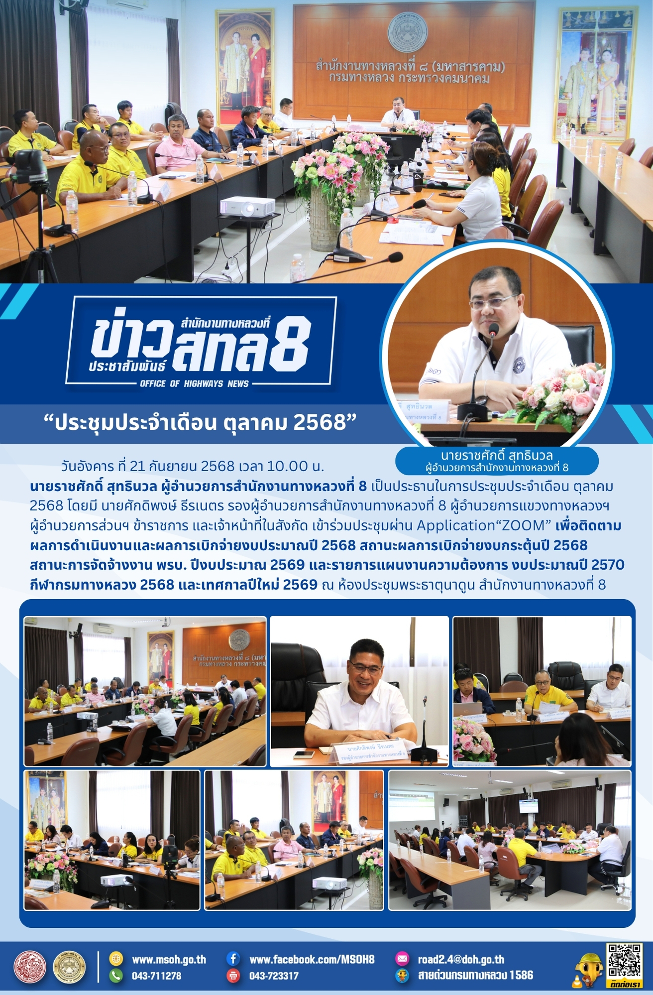 วันศุกร์ ที่ 17 ตุลาคม 2568 เวลา 13.00 น. นายราชศักดิ์ สุทธินวล ผู้อำนวยการสำนักงานทางหลวงที่ 8 พร้อมด้วย นายศักดิพงษ์ ธีรเนตร รองผู้อำนวยการสำนักงานทางหลวงที่ 8 ผู้อำนวยการส่วนฯ และข้าราชการในสังกัด เข้าร่วมประชุมเร่งรัดติดตามผลการดำเนินงานและการเบิกจ่ายงบประมาณรายจ่ายประจำปีงบประมาณ พ.ศ. 2569 และประชุมเตรียมความพร้อมในการจัดทำคำของบประมาณรายจ่ายประจำปีงบประมาณ พ.ศ.2570 ผ่าน Application “ZOOM” ณ ห้องประชุมพระธาตุนาดูน สำนักงานทางหลวงที่ 8