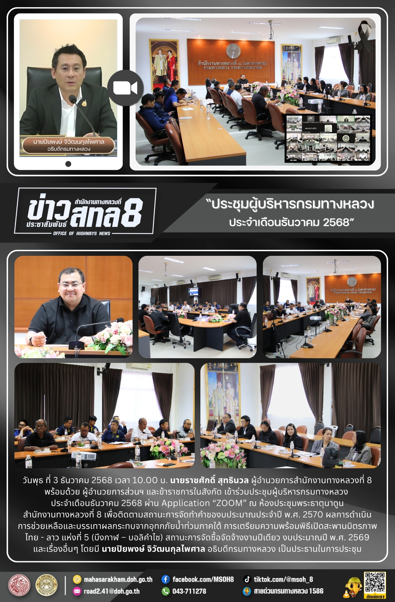 วันพุธ ที่ 3 ธันวาคม 2568 เวลา 10.00 น. นายราชศักดิ์ สุทธินวล ผู้อำนวยการสำนักงานทางหลวงที่ 8 พร้อมด้วย ผู้อำนวยการส่วนฯ และข้าราชการในสังกัด เข้าร่วมประชุมผู้บริหารกรมทางหลวง ประจำเดือนธันวาคม 2568 ผ่าน Application “ZOOM” ณ ห้องประชุมพระธาตุนาดูนสำนักงานทางหลวงที่ 8 เพื่อติดตามสถานะการจัดทำคำของบประมาณประจำปี พ.ศ. 2570 ผลการดำเนินการช่วยเหลือและบรรเทาผลกระทบจากอุทกภัยน้ำท่วมภาคใต้ การเตรียมความพร้อมพิธีเปิดสะพานมิตรภาพไทย - ลาว แห่งที่ 5 (บึงกาฬ – บอลิคำไซ) สถานะการจัดซื้อจัดจ้างงานปีเดียว งบประมาณปี พ.ศ. 2569และเรื่องอื่นๆ โดยมี นายปิยพงษ์ จิวัฒนกุลไพศาล อธิบดีกรมทางหลวง เป็นประธานในการประชุม