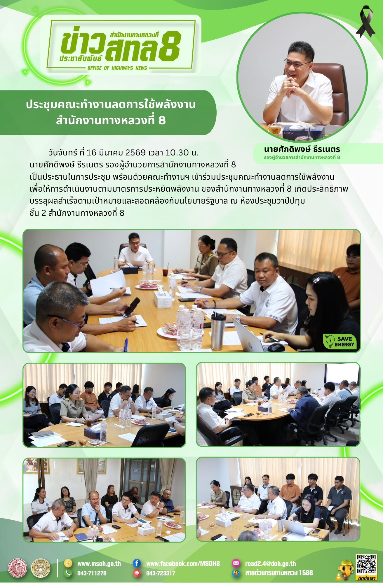วันจันทร์ ที่ 16 มีนาคม 2569 เวลา 10.30 น. นายศักดิพงษ์ ธีรเนตร รองผู้อำนวยการสำนักงานทางหลวงที่ 8 เป็นประธานในการประชุม พร้อมด้วยคณะทำงานฯ เข้าร่วมประชุมคณะทำงานลดการใช้พลังงาน เพื่อให้การดำเนินงานตามมาตรการประหยัดพลังงาน ของสำนักงานทางหลวงที่ 8 เกิดประสิทธิภาพบรรลุผลสำเร็จตามเป้าหมายและสอดคล้องกับนโยบายรัฐบาล ณ ห้องประชุมวาปีปทุม ชั้น 2 สำนักงานทางหลวงที่ 8