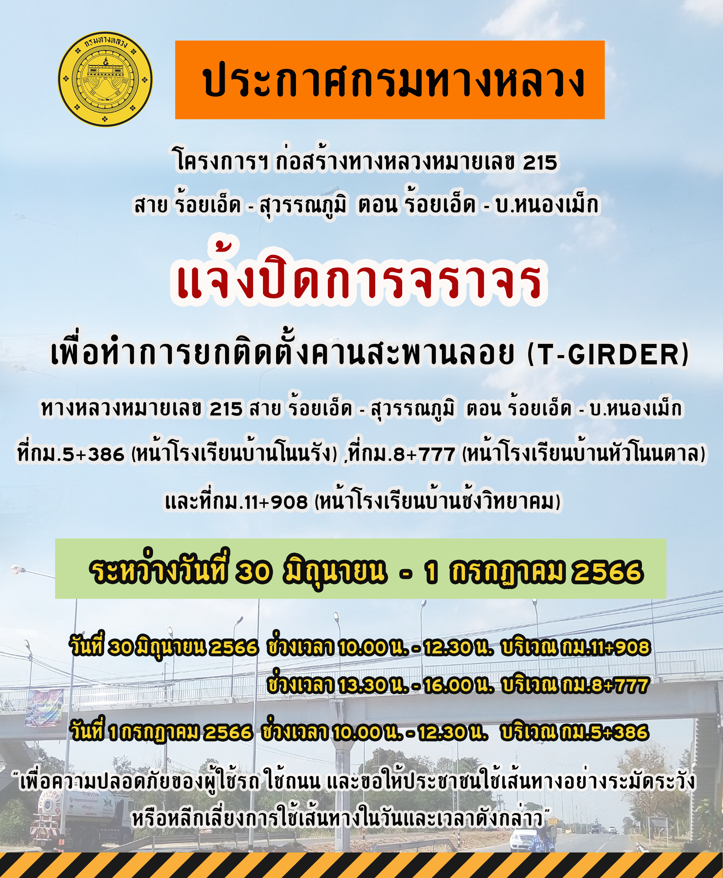 694 28/06/2566 "แจ้งปิดการจราจร เพื่อทำการยกติดตั้งคานสะพานลอย (T-Girder) ทล.215 สาย ร้อยเอ็ด - สุวรรณภูมิ ตอน ร้อยเอ็ด - บ.หนองเม็ก ที่กม.5+386 ,ที่กม.8+777 และที่กม.11+908"