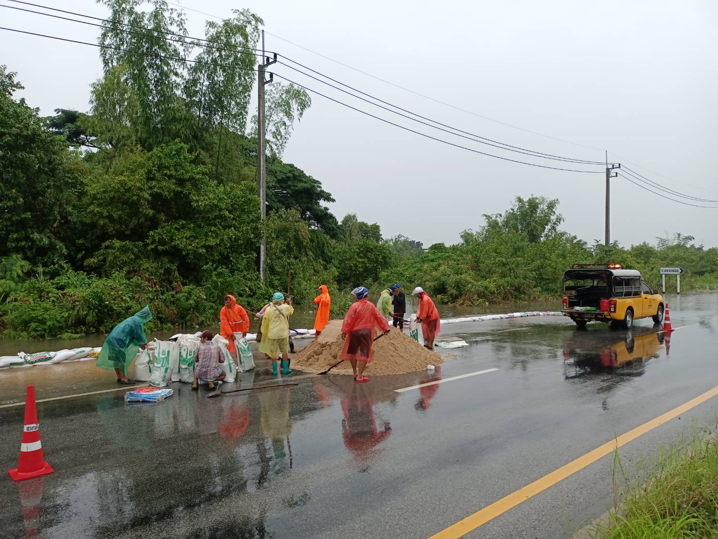 "บรรจุทรายลงกระสอบเพื่อทำแนวป้องกันน้ำท่วมผิวทาง ทล. 214 กม.29+600 - กม.29+900 ด้านขวาทาง"