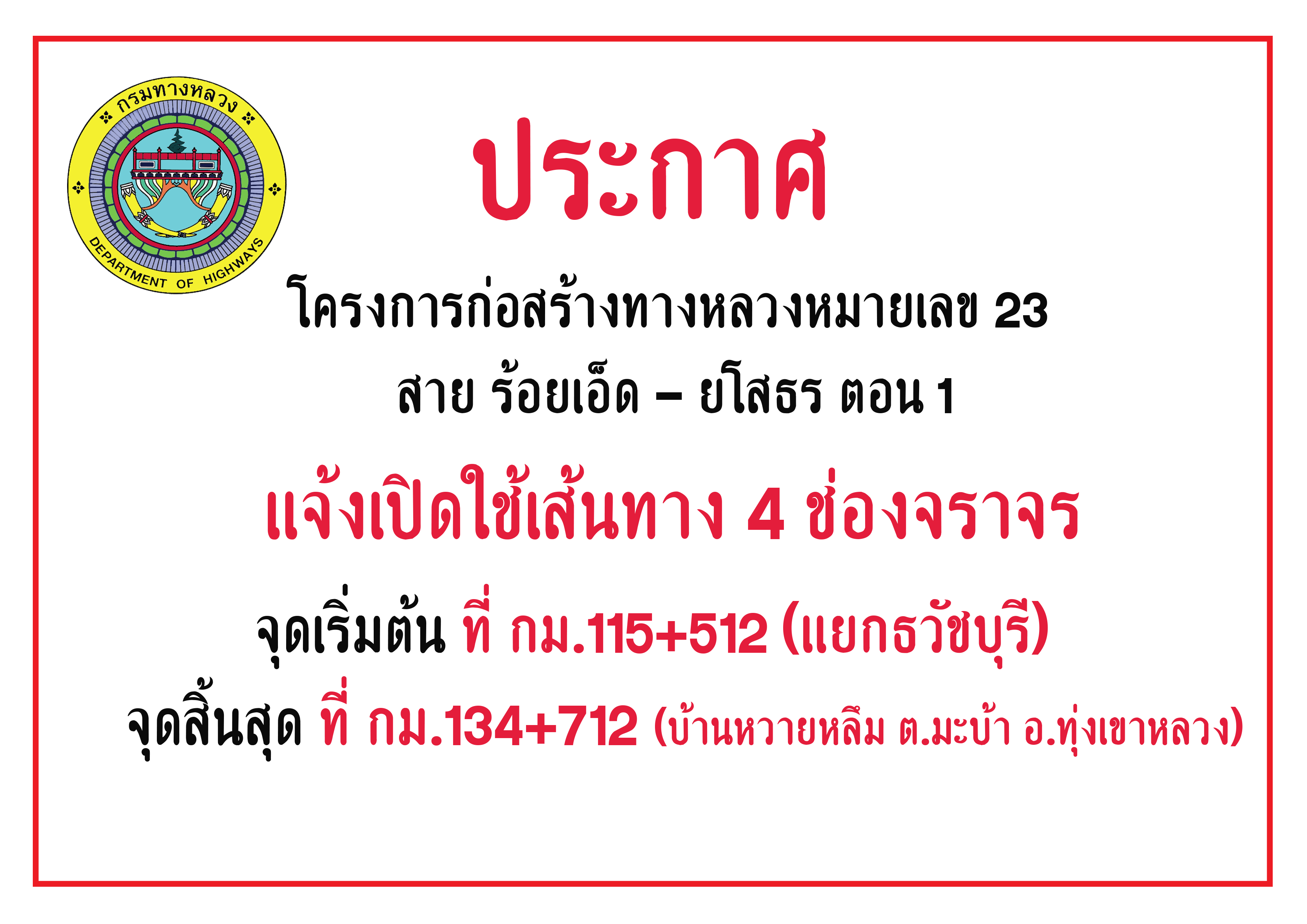 แจ้งเปิดใช้ช่องจราจร 4 ช่องจราจร ทางหลวงหมายเลข 23 สาย ร้อยเอ็ด – เสลภูมิ ระหว่าง กม.115+512 (แยกธวัชบุรี) - กม.134+712 (บ้านหวายหลึม ต.มะบ้า อ.ทุ่งเขาหลวง)