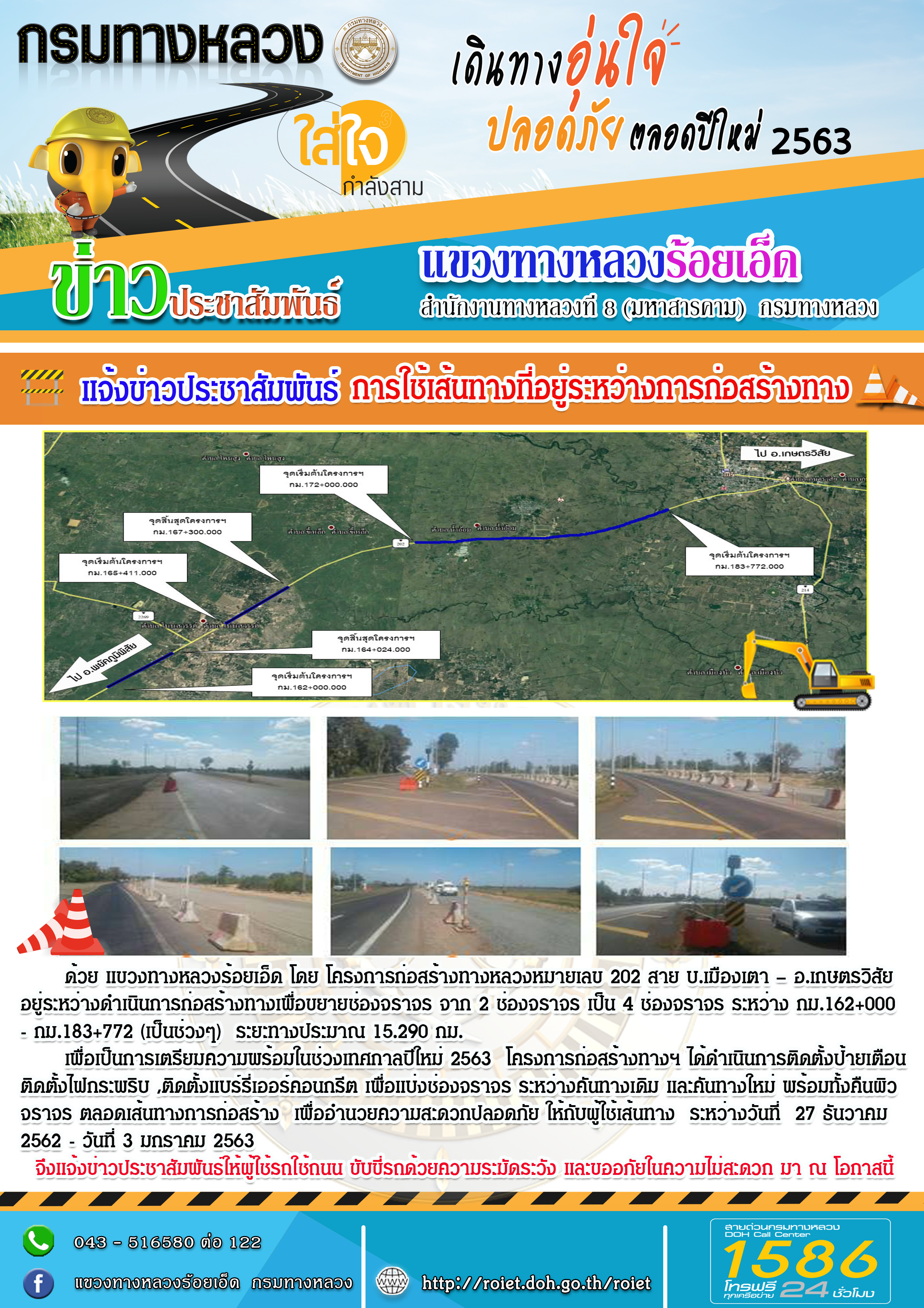 แจ้งข่าวประชาสัมพันธ์ การใช้เส้นทางที่อยู่ระหว่างการก่อสร้างทาง ทล.202 ช่วงเทศกาลปีใหม่ 2563