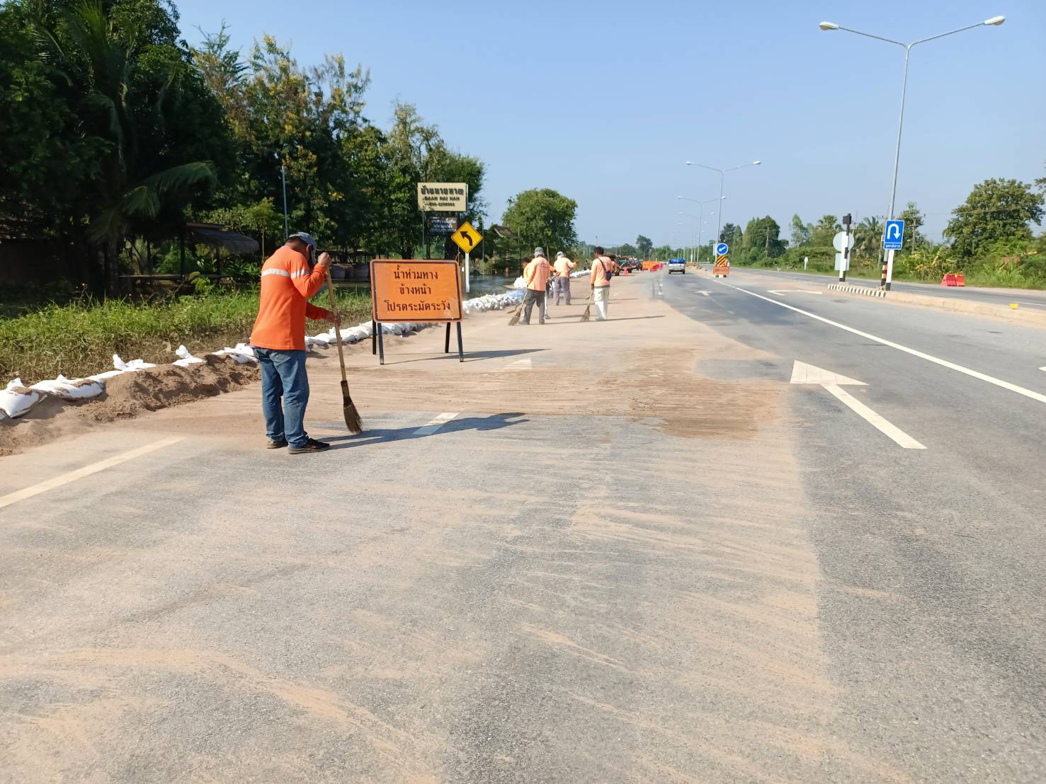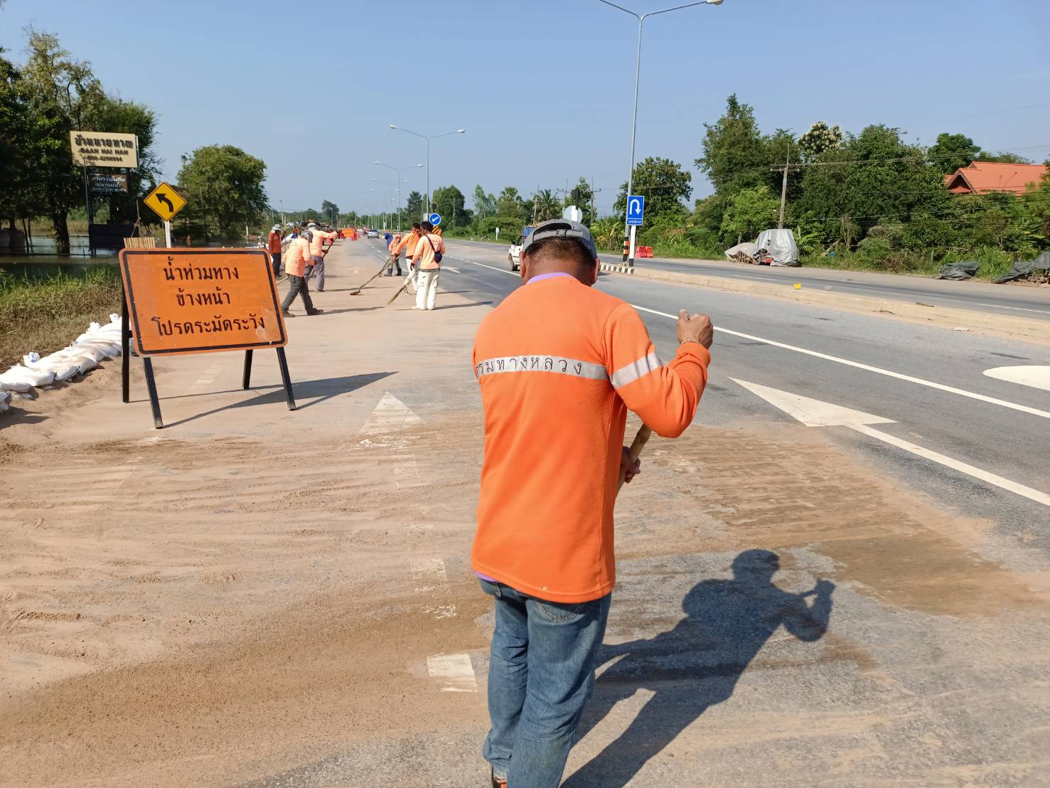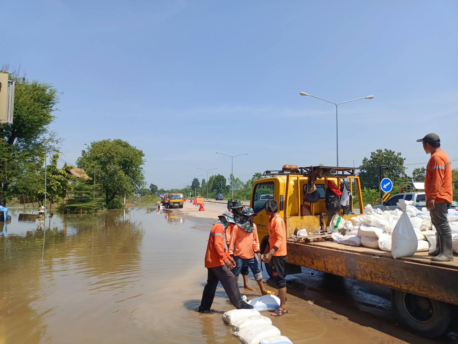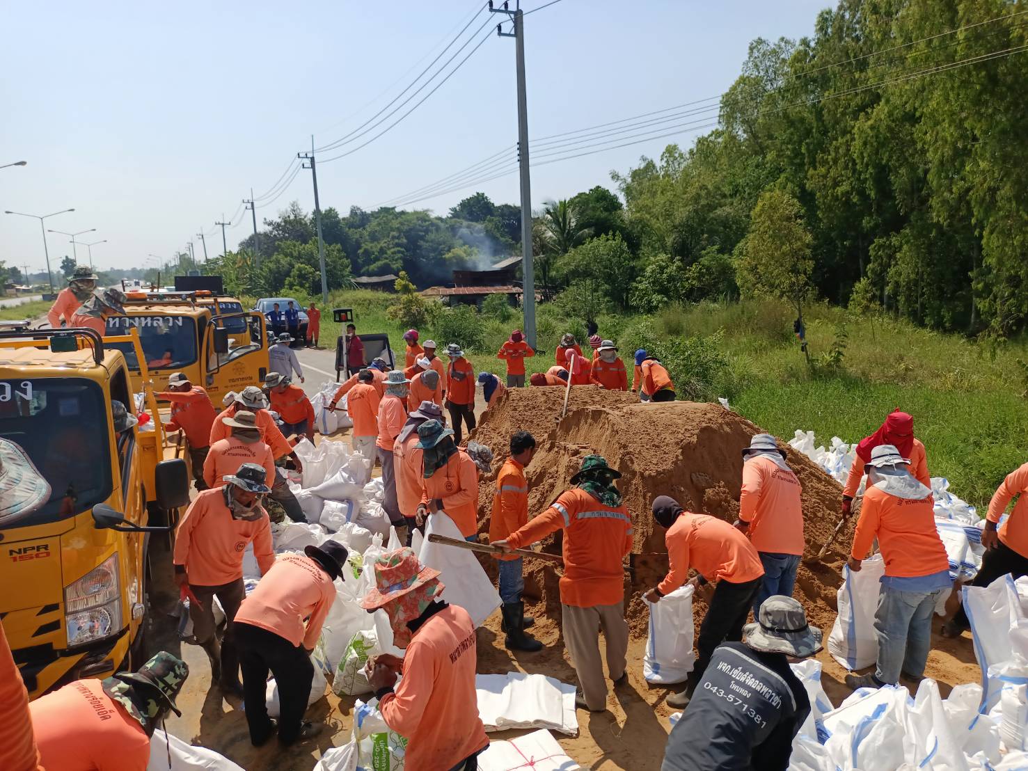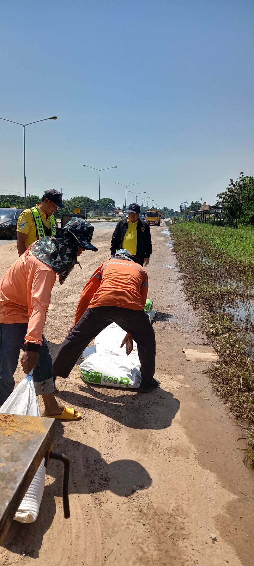 นายศราวุฒิ ภู่ชินาพันธ์ ผู้อำนวยการแขวงทางหลวงร้อยเอ็ด เร่งระดมเจ้าหน้าที่ทุกหมวดทางหลวงในสังกัดแขวงทางหลวงร้อยเอ็ด ร่วมบรรจุทรายลงกระสอบเพื่อทำแนวป้องกันน้ำท่วมผิวทาง ในทางหลวงหมายเลข 214 ตอน ลำชี - ร้อยเอ็ด ระหว่าง กม.29+600 - กม.29+900 ด้านขวาทาง