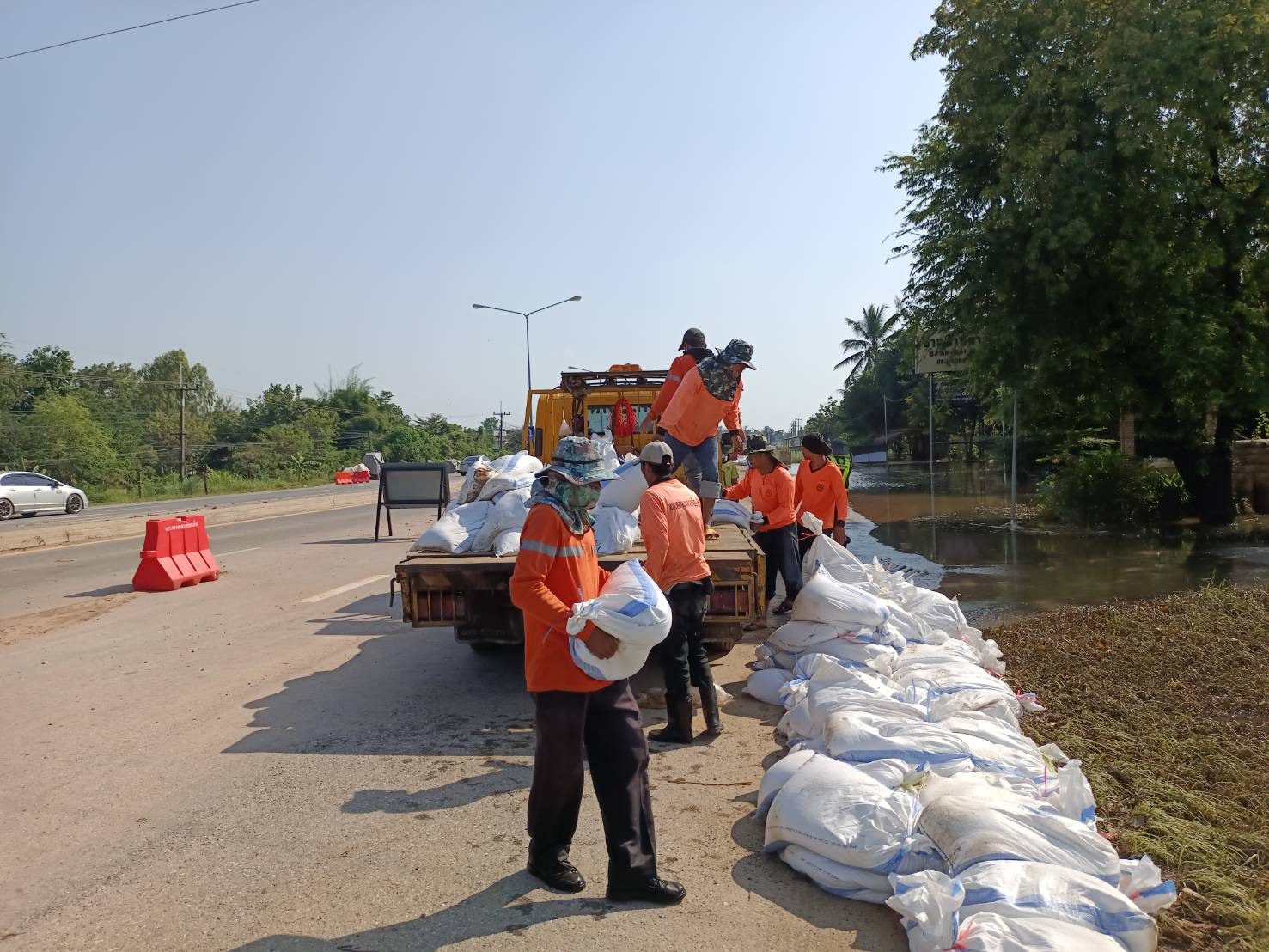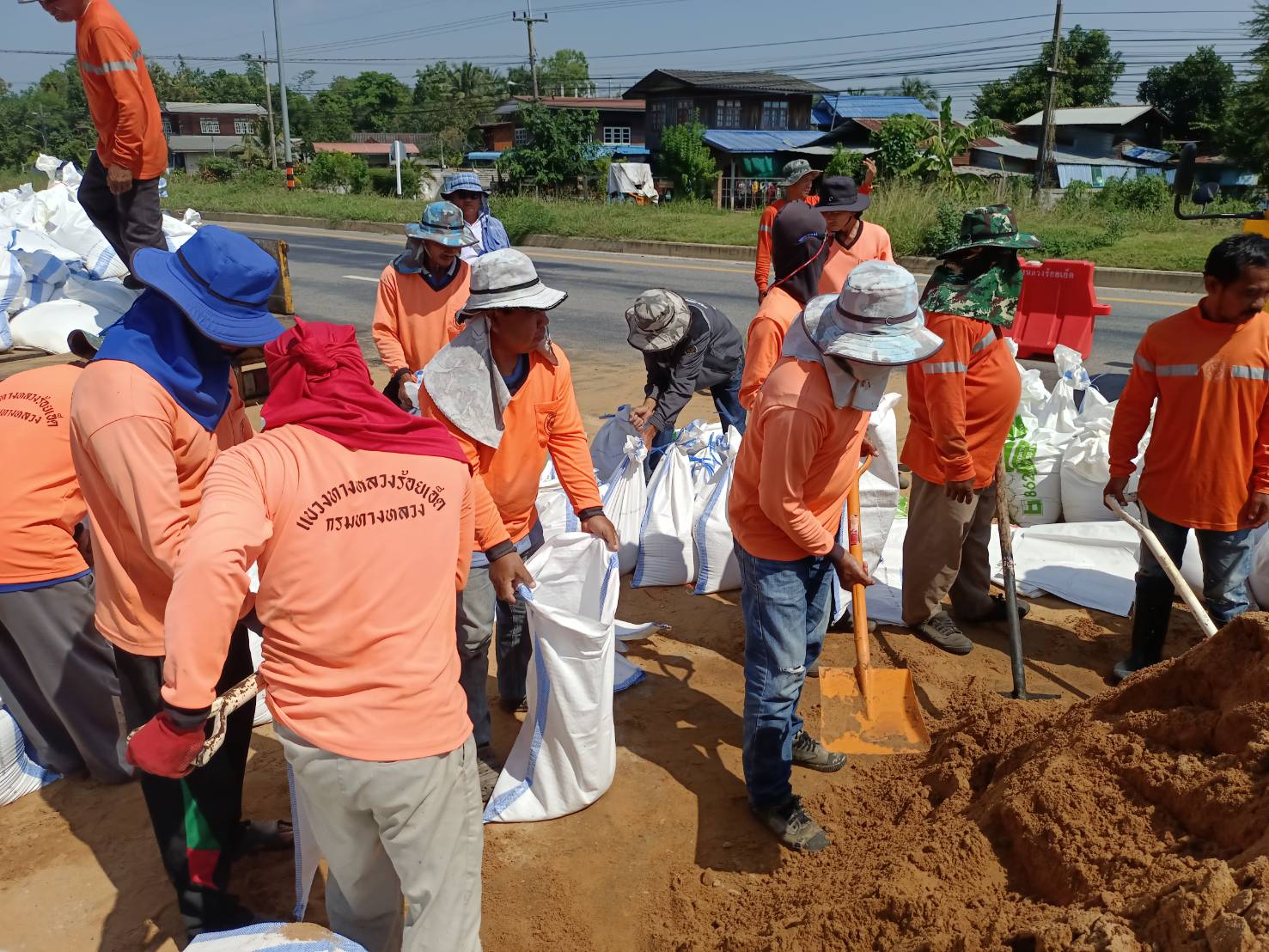 "บรรจุทรายลงกระสอบเพื่อทำแนวป้องกันน้ำท่วมผิวทาง ทล. 214 กม.29+600 - กม.29+900 ด้านขวาทาง"