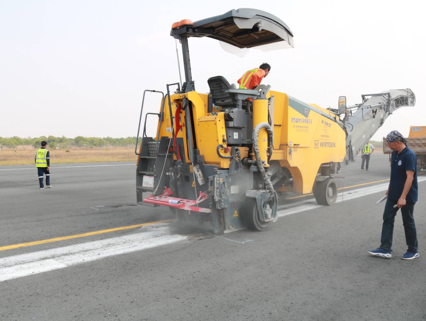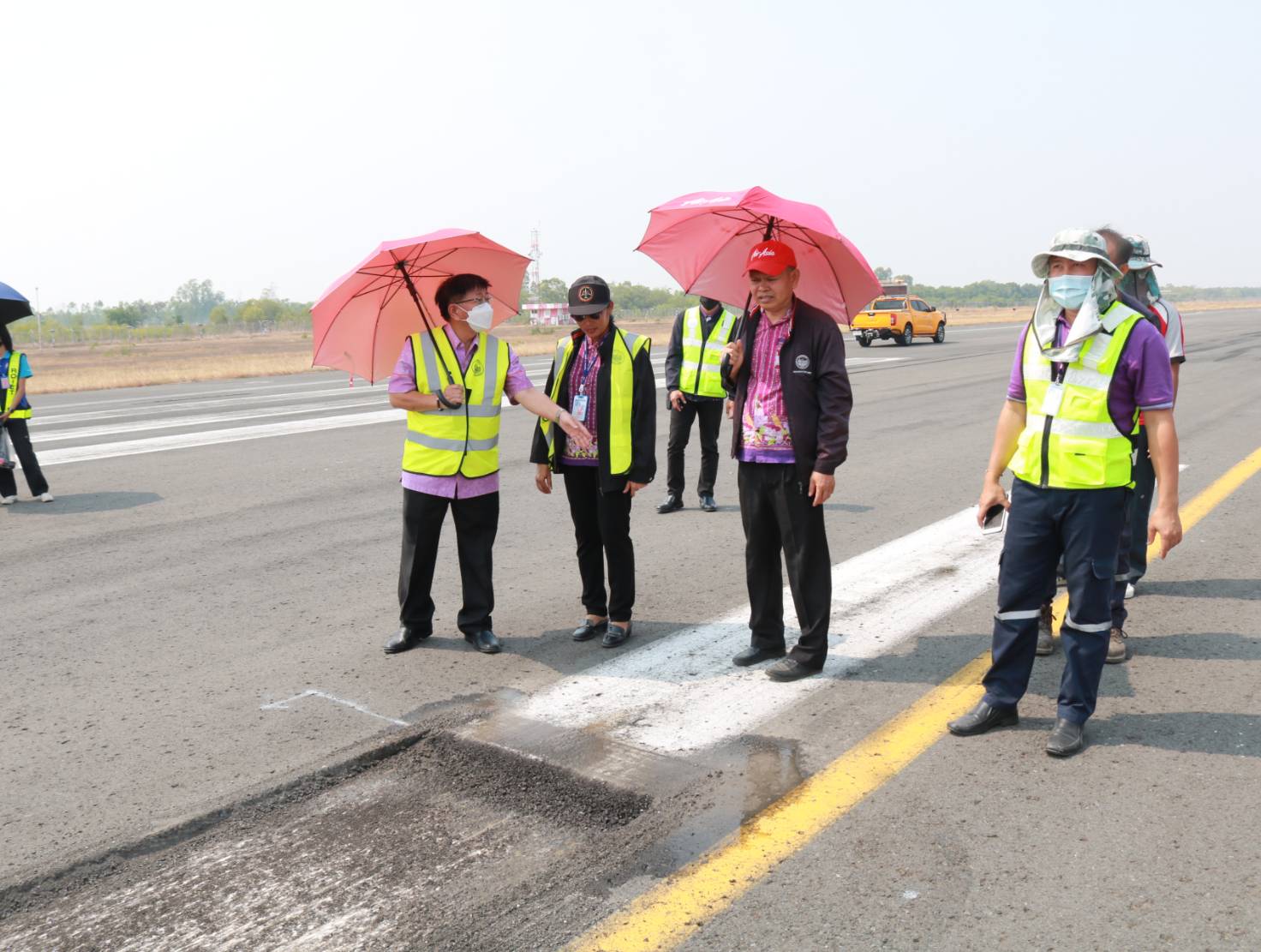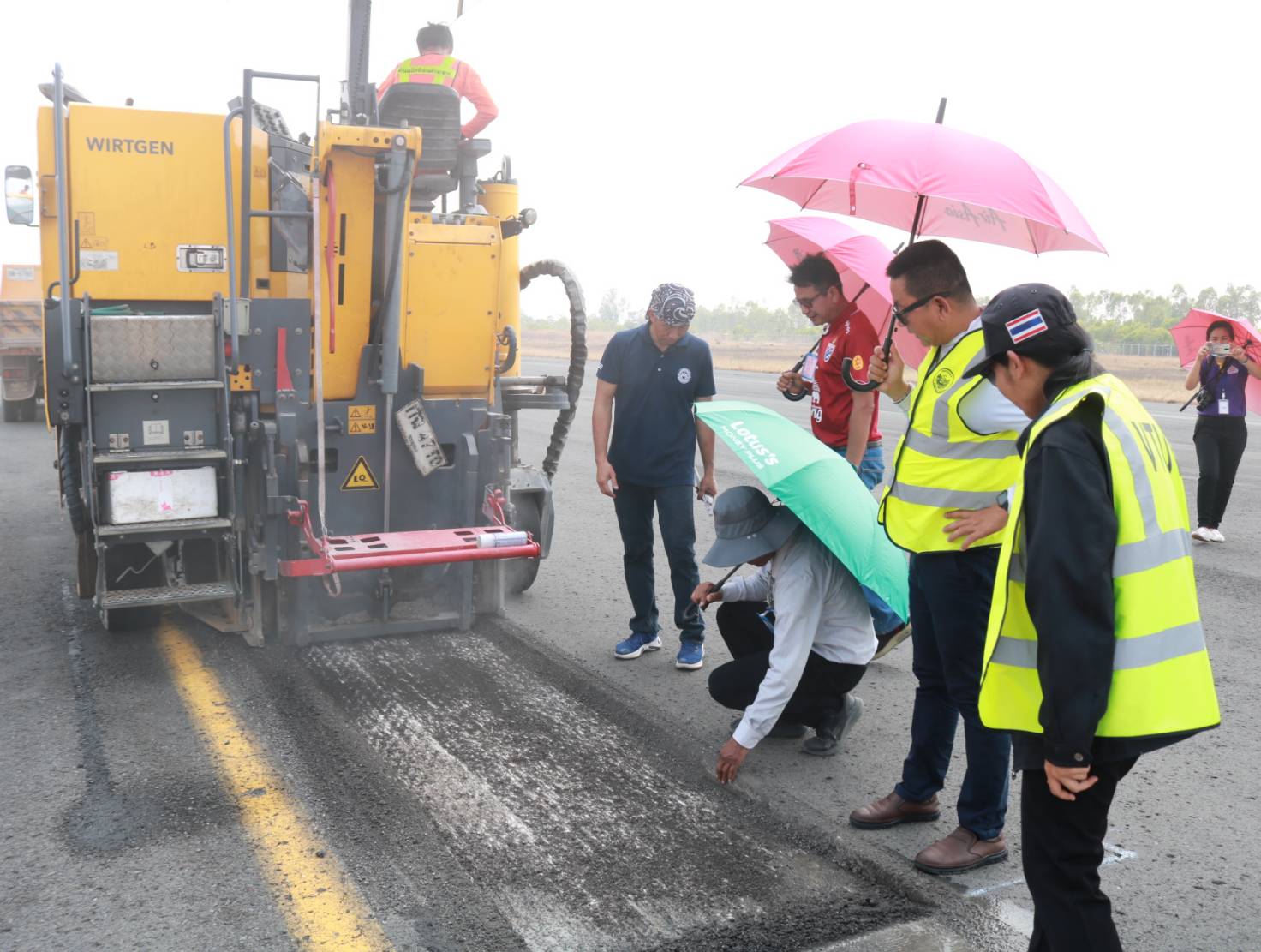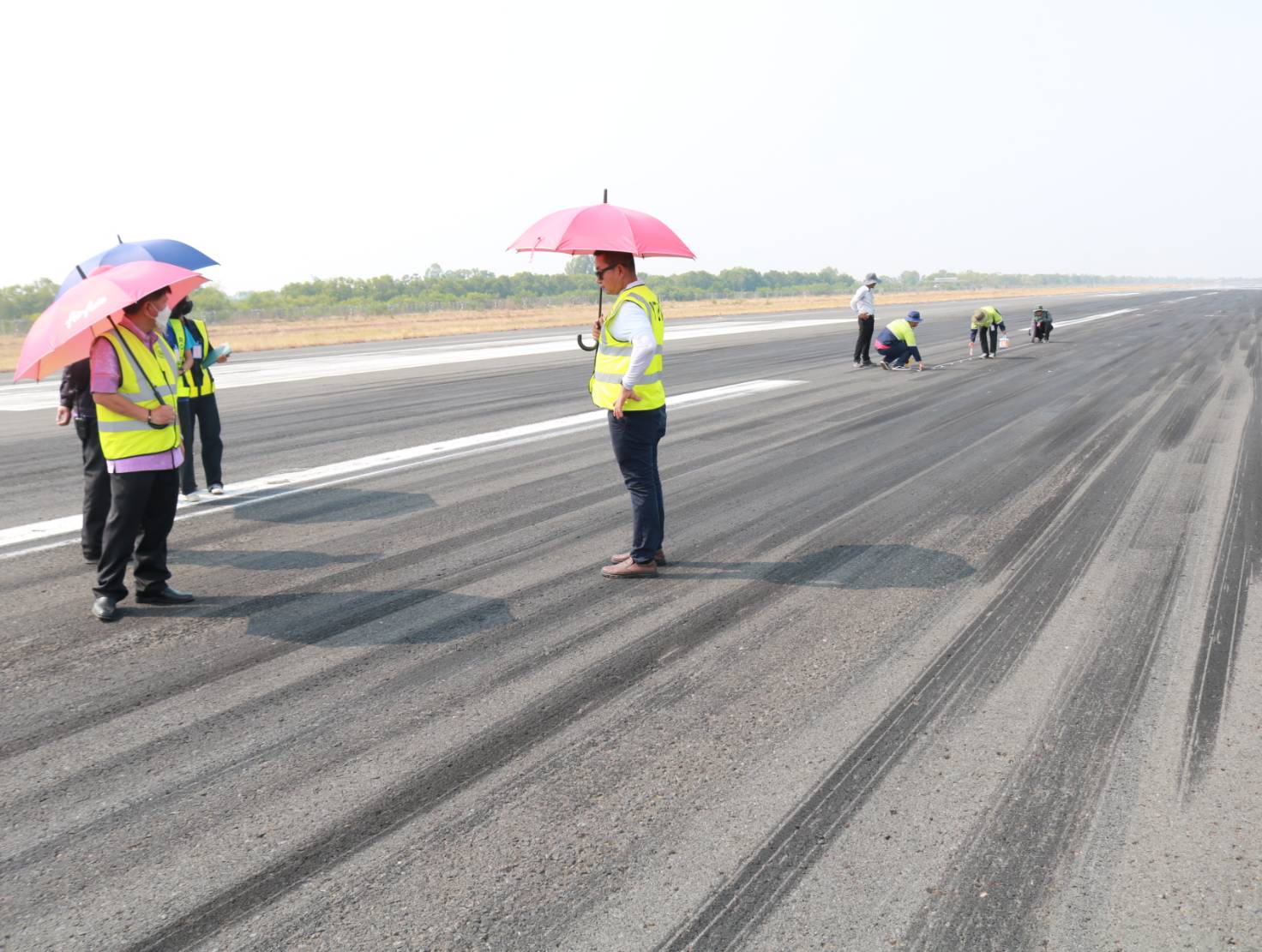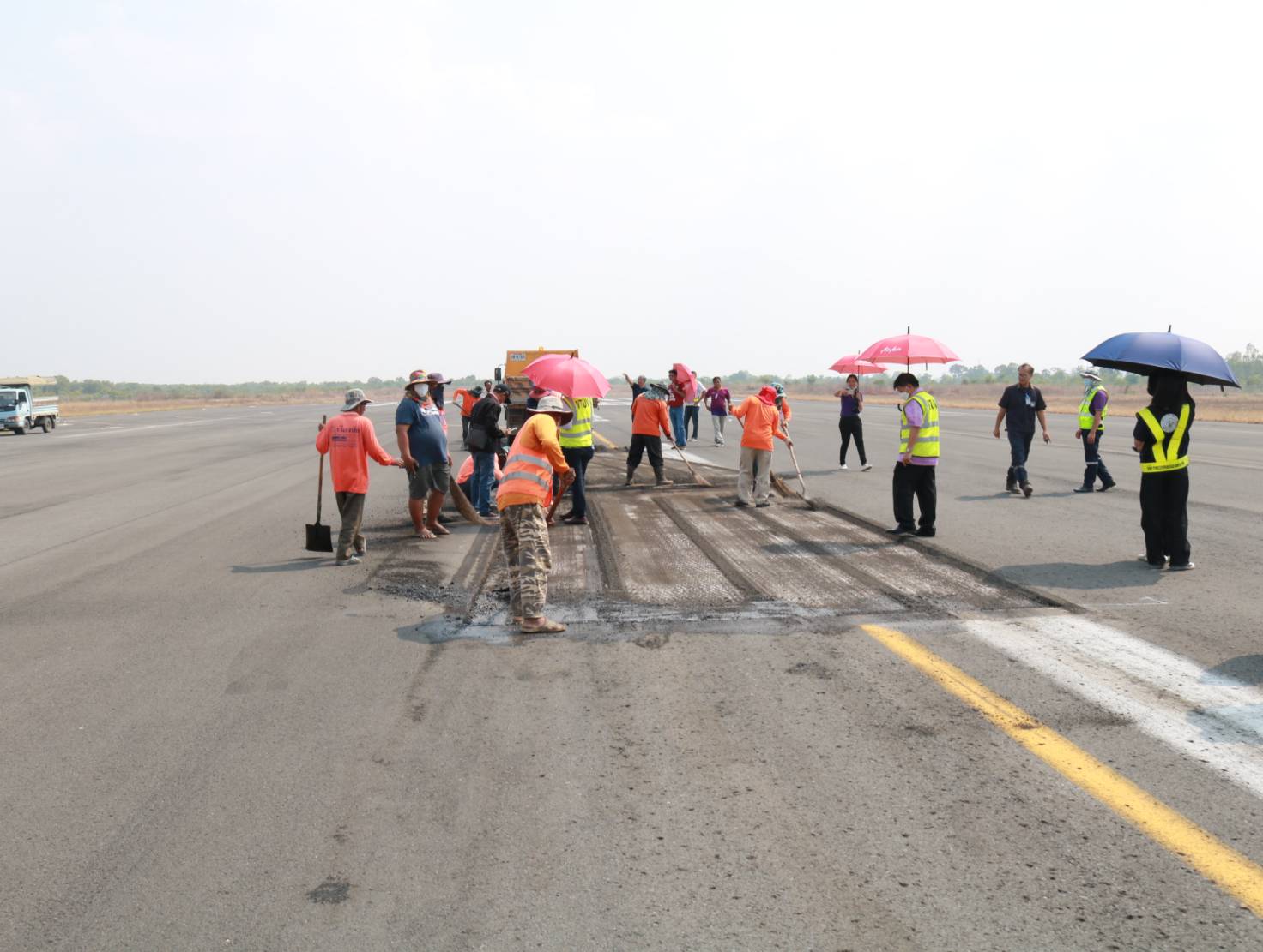 "ร่วมลงพื้นที่อำนวยการตรวจสอบแนะนำวิธีการปฏิบัติงานการขูดไส และซ่อมผิวแอสฟัลต์ ของทางวิ่ง (Runway) บริเวณทางขึ้น - ทางลงที่เกิดหลุดร่อนเสียหายอันจะก่อให้เกิดอันตรายแก่ผู้ใช้บริการ"