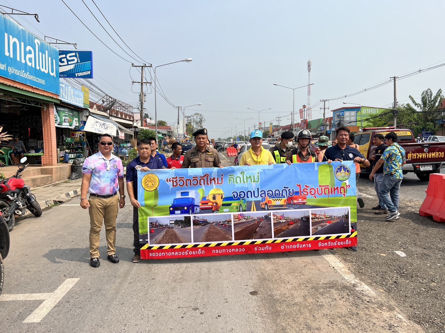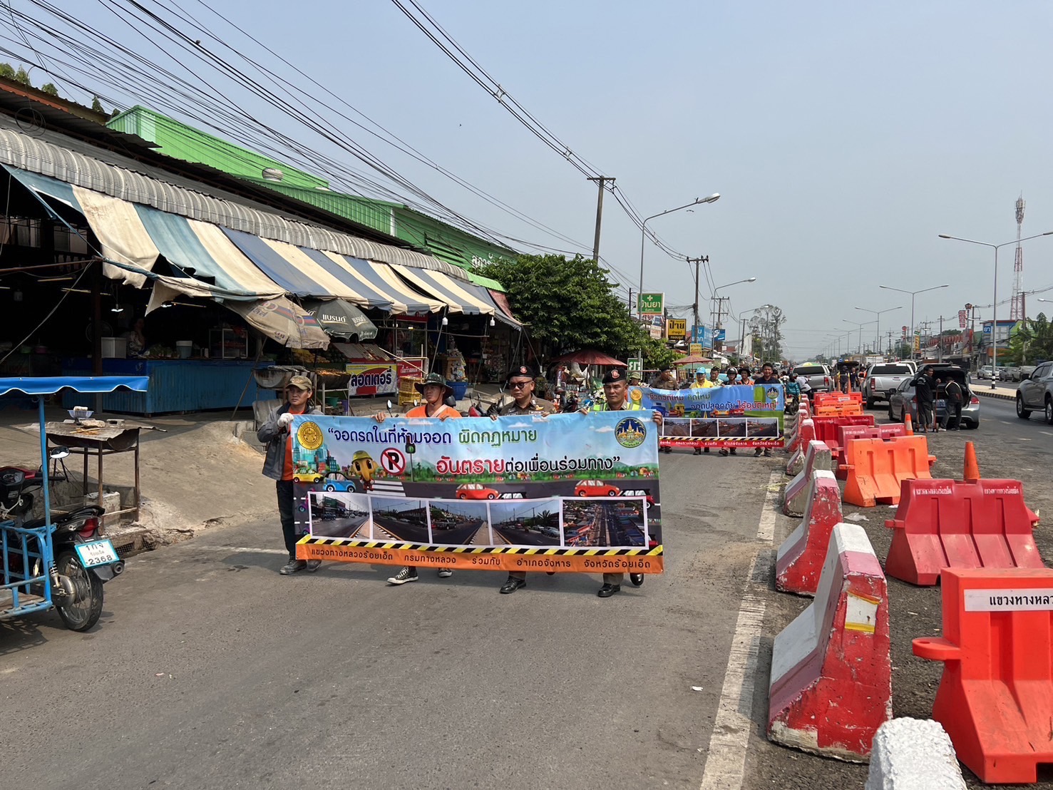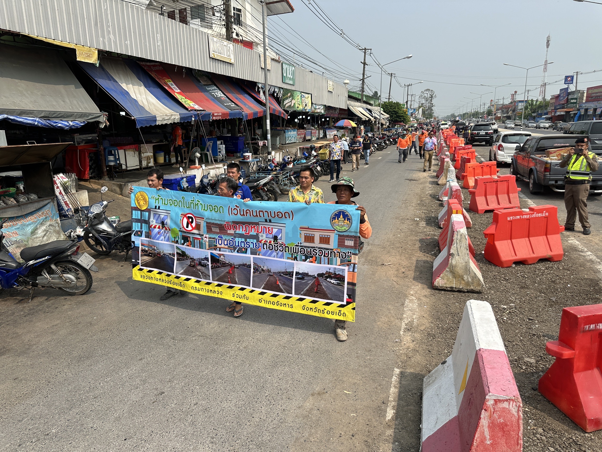 "ร่วมรณรงค์การปฏิบัติตามกฎหมาย ห้ามจอดในที่ห้ามจอด การจัดระเบียบการจราจร หน้าตลาดจังหาร ในทางหลวงหมายเลข 214 ตอน ลำชี – ร้อยเอ็ด ระหว่าง กม.37+500 - กม.38+300 ด้านขวาทาง"
