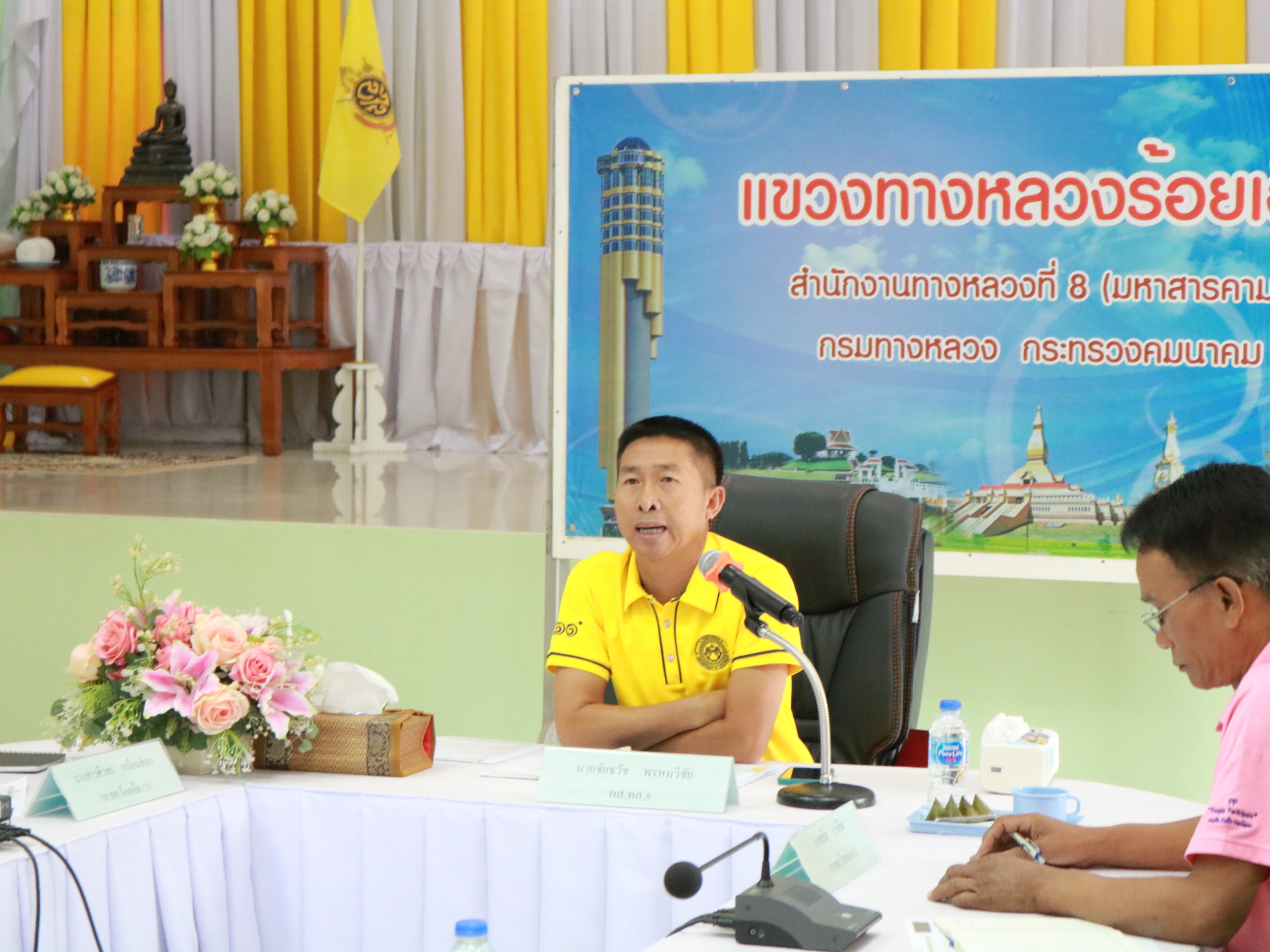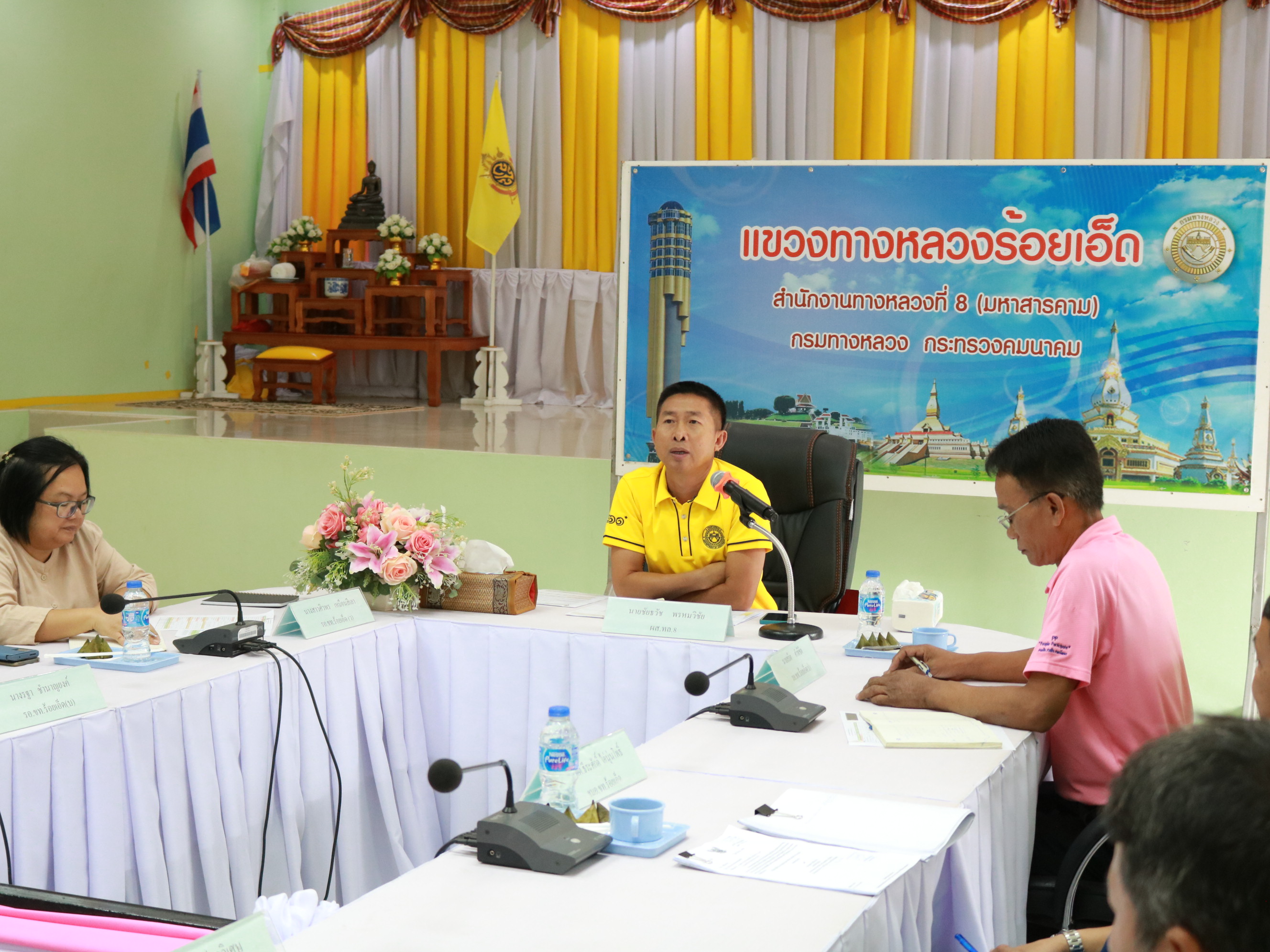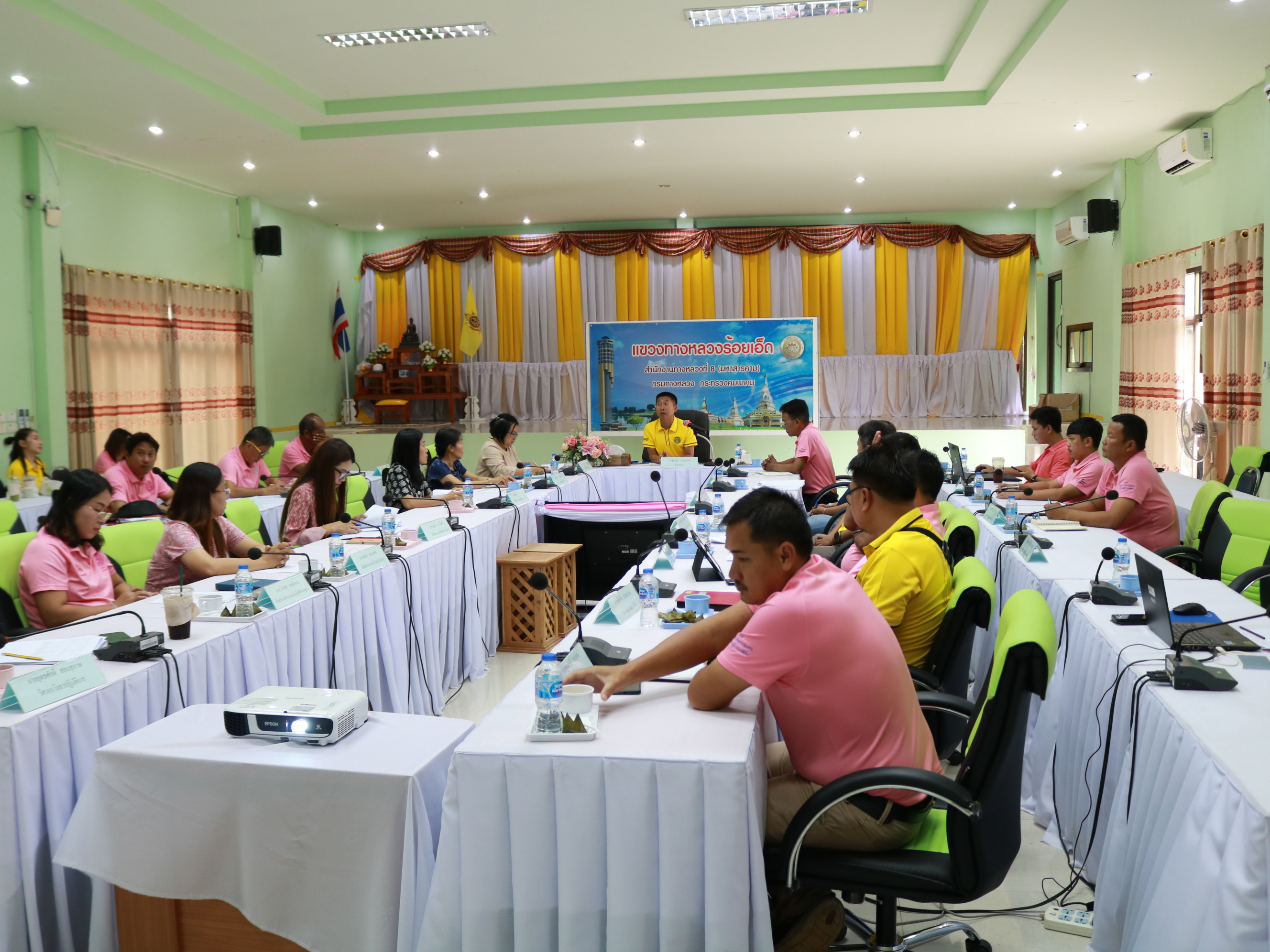 นายชัยธวัช พรหมวิชัย ผู้อำนวยการสำนักงานทางหลวงที่ 8 (มหาสารคาม) รักษาราชการแทน ผู้อำนวยการแขวงทางหลวงร้อยเอ็ด พร้อมด้วยนายสถิต คำพิชิต รองผู้อำนวยการแขวงทางหลวงร้อยเอ็ด ฝ่ายปฏิบัติการ ,นางสาวศิวพร เหมือนสีเลา รองผู้อำนวยการแขวงทางหลวงร้อยเอ็ด ฝ่ายวิศวกรรม ,นางรฐา ชำนาญยงค์ รองผู้อำนวยการแขวงทางหลวงร้อยเอ็ด ฝ่ายบริหาร และคณะเจ้าหน้าที่แขวงทางหลวงร้อยเอ็ด ร่วมประชุมเพื่อติดตามความก้าวหน้างานโครงการฯ ปี 67 ,งานโครงการฯ ปี 68 ปี 69 และสรุปผลการดำเนินงาน ปัญหาและอุปสรรค ณ ห้องประชุมจุลละโพธิ แขวงทางหลวงร้อยเอ็ด
