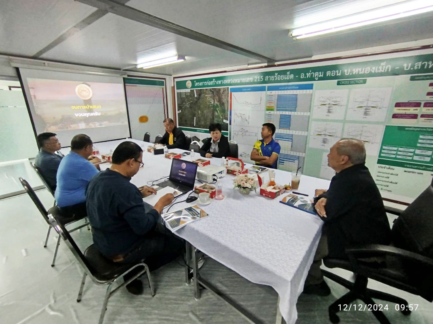 โครงการก่อสร้างทางหลวงหมายเลข 215 สาย ร้อยเอ็ด - อ.ท่าตูม ตอน บ.หนองเม็ก - บ.สาหร่าย ระหว่าง กม.33+000 - กม.39+500 ,กม.42+500 – กม.46+050 ,กม.66+300 - กม.72+200 และ กม.78+500 - กม.85+110 โดยมีบริษัท ช.ทวีก่อสร้าง จำกัด เป็นผู้รับจ้าง ณ ห้องประชุมสำนักงานโครงการฯ
