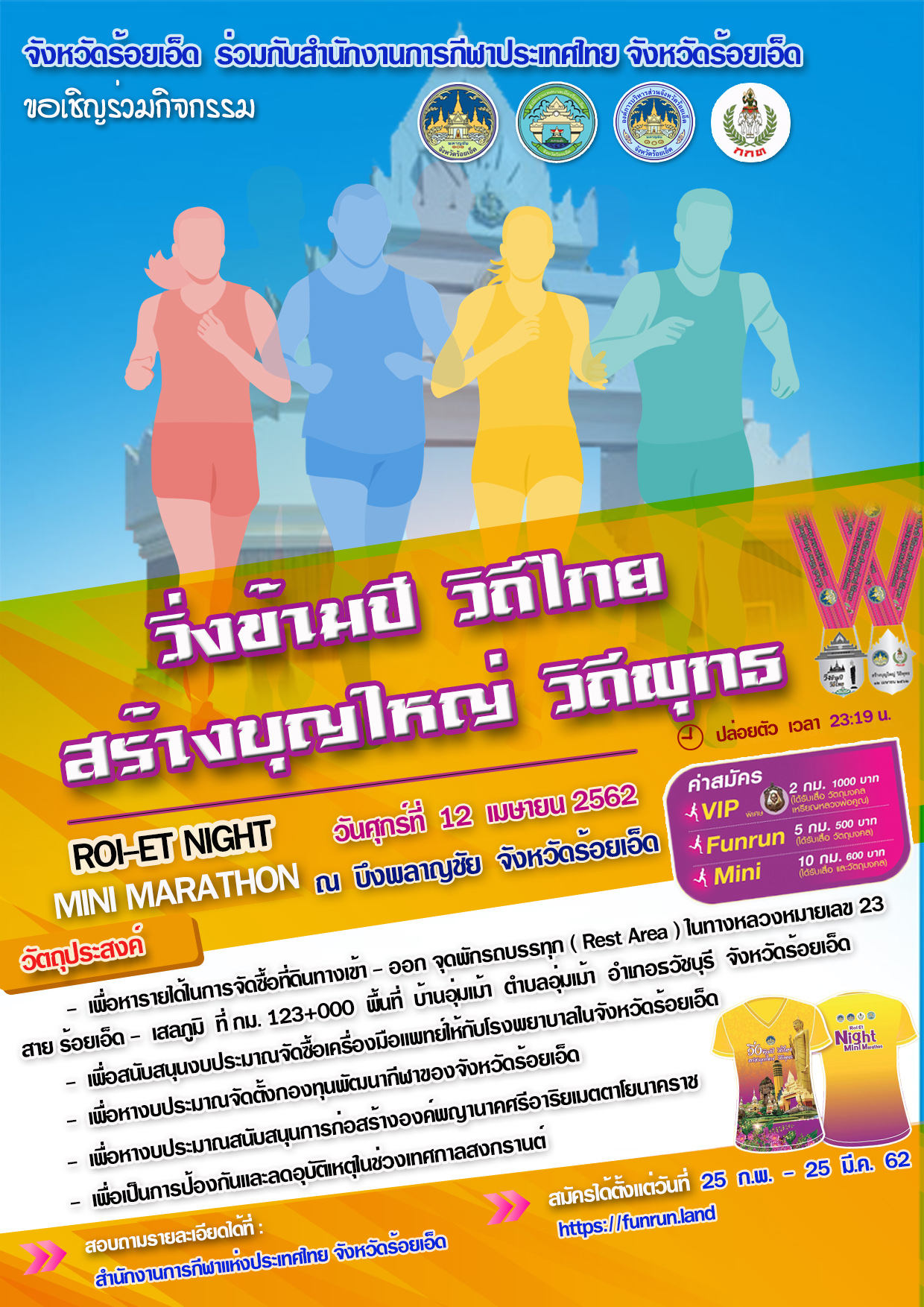 นายสมัย คะนะมะ รองผู้อำนวยการแขวงทางหลวงร้อยเอ็ด ฝ่ายวิศวกรรม คณะเจ้าหน้าที่แขวงทางหลวงร้อยเอ็ด ร่วมกับส่วนราชการในจังหวัดร้อยเอ็ด และสำนักงานการกีฬาแห่งประเทศไทยจังหวัดร้อยเอ็ด ร่วม “แถลงข่าวงานวิ่งข้ามปี วิถีไทย สร้างบุญใหญ่ วิถีพุทธ” โดยมีวัตถุประสงค์เพื่อหารายได้ในการจัดซื้อที่ดินทางเข้า - ออก จุดพักรถบรรทุก ( Rest Area) ในทางหลวงหมายเลข 23 สาย ร้อยเอ็ด – เสลภูมิ ที่ กม. 123+000 พื้นที่ บ้านอุ่มเม้า ตำบลอุ่มเม้า อำเภอธวัชบุรี จังหวัดร้อยเอ็ด ,ก่อสร้างองค์พญานาคศรีอาริยเมตตาโยนาคราช และจัดซื้อเครื่องมือแพทย์ให้กับโรงพยาบาลในจังหวัดร้อยเอ็ด โดยมีนายวันชัย คงเกษม ผู้ว่าราชการจังหวัดร้อยเอ็ด เป็นประธานในการแถลงข่าว ณ ลานสาเกตุนคร สวนสมเด็จพระศรีนครินทร์ร้อยเอ็ด