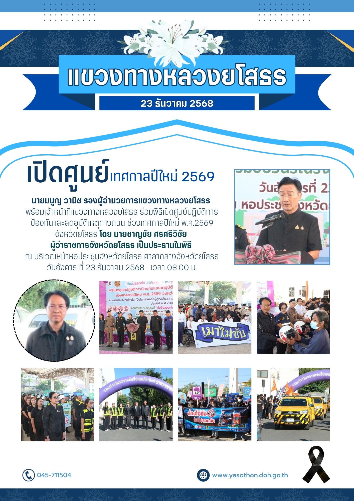 เปิดศูนย์ปฏิบัติการป้องกันและลดอุบัติเหตุทางถนน ช่วงเทศกาลปีใหม่ พ.ศ.2569 จังหวัดยโสธร