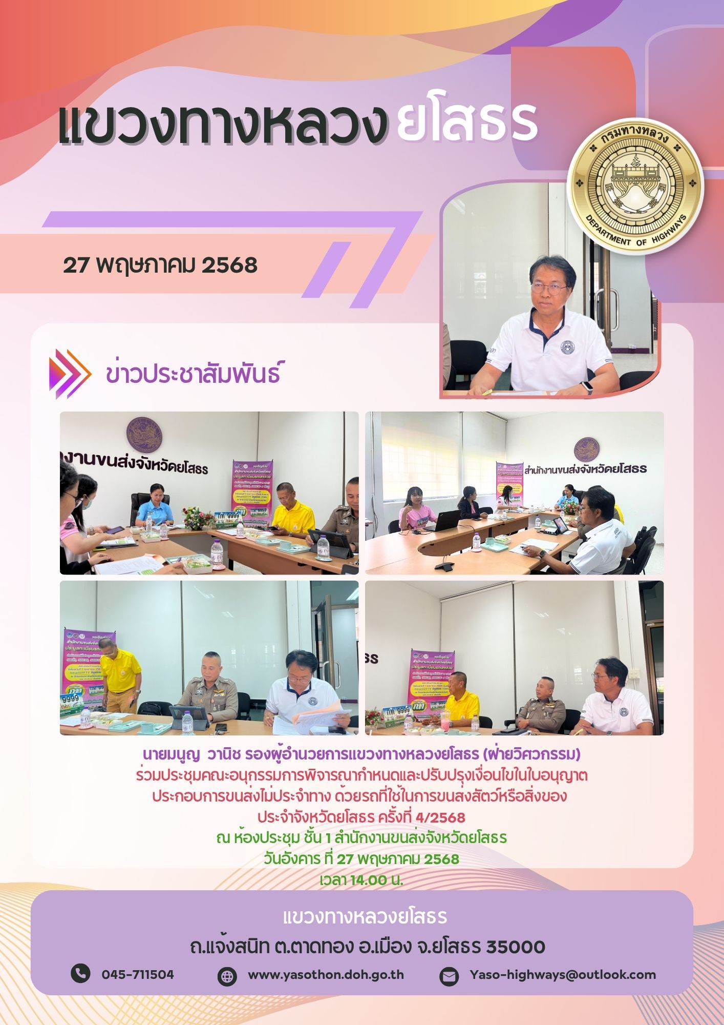 ประชุมคณะอนุกรรมการพิจารณากำหนดและปรับปรุงเงื่อนไขในใบอนุญาตประกอบการขนส่งไม่ประจำทาง ด้วยรถที่ใช้ในการขนส่งสัตว์หรือสิ่งของประจำจังหวัดยโสธร ครั้งที่ 4/2568