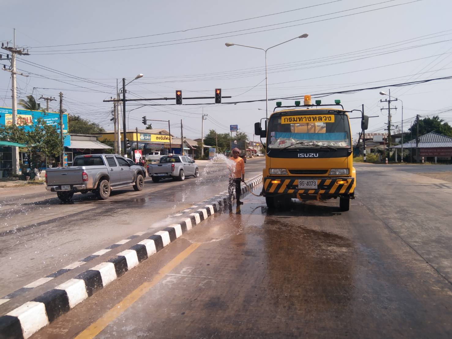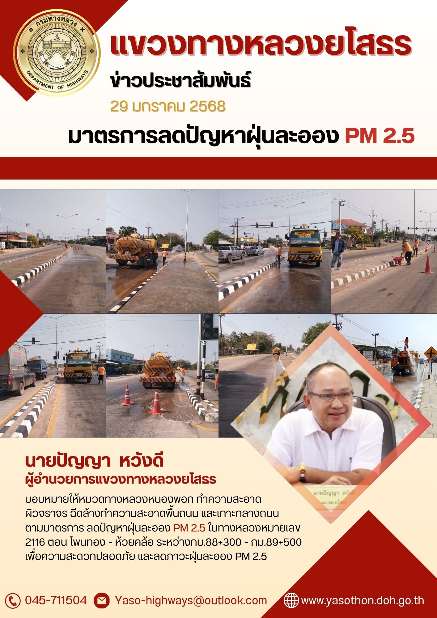 มอบหมายให้หมวดทางหลวงหนองพอก ทำความสะอาด ผิวจราจร ฉีดล้างทำความสะอาดพื้นถนน และเกาะกลางถนน ตามมาตรการลดปัญหาฝุ่นละออง PM 2.5 ในทางหลวงหมายเลข 2116 ตอน โพนทอง - ห้วยคล้อ ระหว่าง กม.88+300 - กม.89+500 เพื่อความสะอาดเรียบร้อย และลดภาวะฝุ่นละออง PM 2.5
