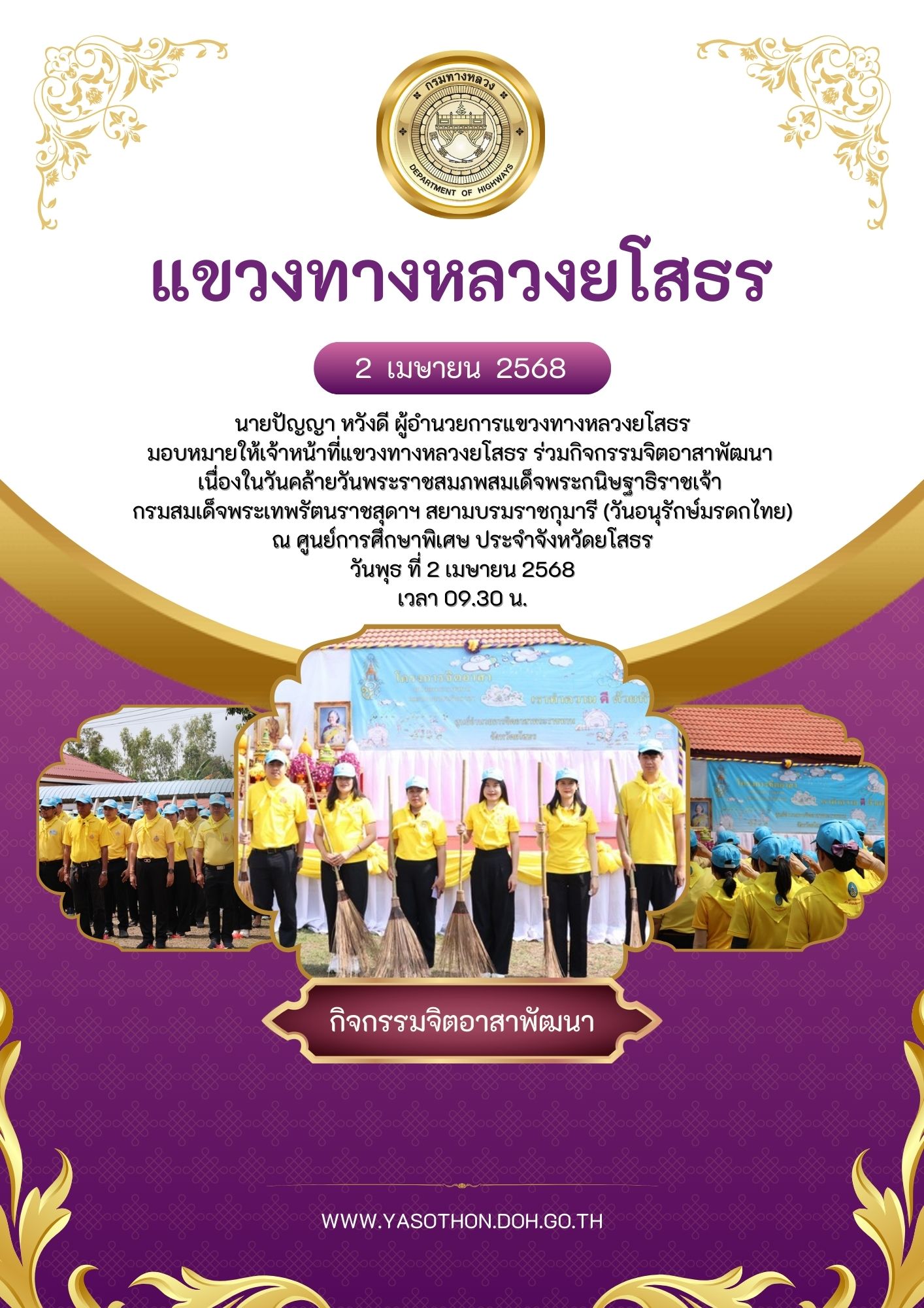 มอบหมายให้เจ้าหน้าที่แขวงทางหลวงยโสธร ร่วมกิจกรรมจิตอาสาพัฒนา เนื่องในวันคล้ายวันพระราชสมภพสมเด็จพระกนิษฐาธิราชเจ้า